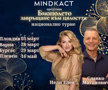 Лекция, медитация и живо енергийно изцеление с Нели Елея и Славко Матанович. Дълбоко трансформиращо преживяване, което разкрива силата на човешката енергия и пътя към вътрешна хармония.